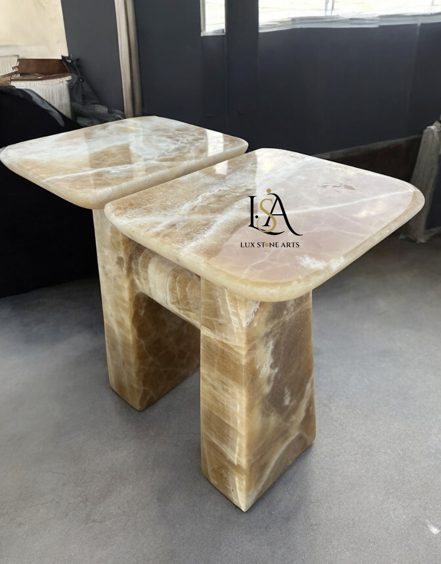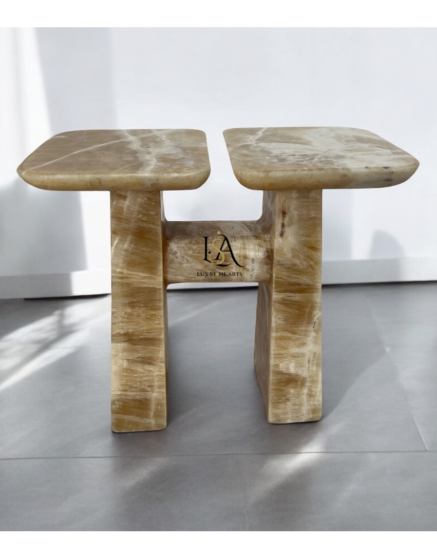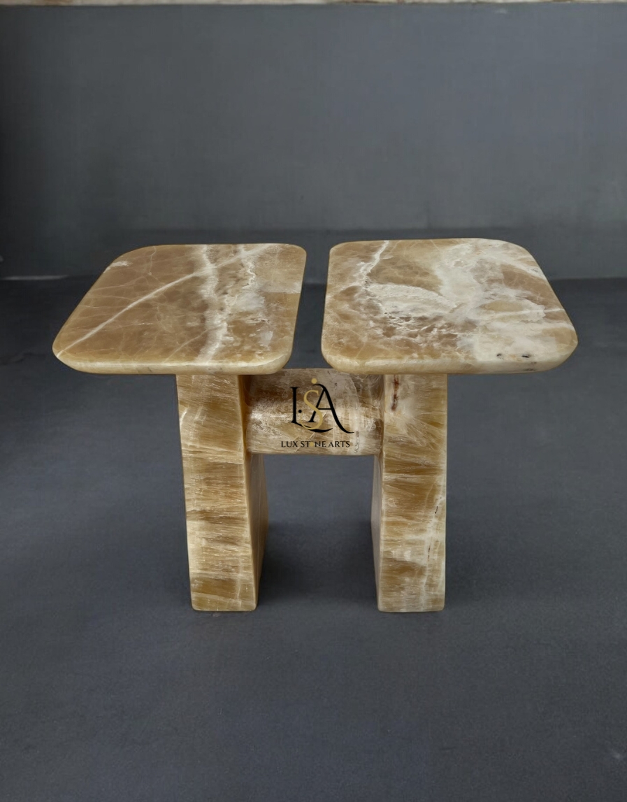 A dual-topped masterpiece in Imported Caramel Onyx Marble, resting on an elegant H-shaped base, symbolizing harmony and balance.